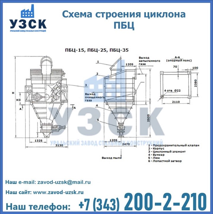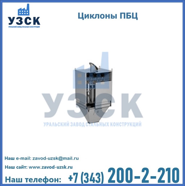 Завод «УЗСК» в Белоруссии предлагает приобрести циклоны ПБЦ и прочие устройства, полностью укомплектованные и готовые к эксплуатации. Мы гарантируем соответствие оборудования всем требованиям ГОСТ и ТУ, износостойкость и высокую производительность предлагаемого оборудования. Уральский Завод Стальных Конструкций изготавливает и продает надежное, эффективное и производительное оборудование, имеющее длительную гарантию и большой эксплуатационный ресурс. Если требуется изготовить циклон нестандартных размеров, то такой вариант выполнения заказа тоже предусмотрен, так как предприятие имеет собственные производственные площади и надежных поставщиков. На все поставляемое или производимое оборудование имеются чертежи и прочая техническая документация. Заказать и купить циклоны или прочее оборудование высокого качества и по доступной цене можно через наш сайт или по указанному в разделе «Контакты» телефону.