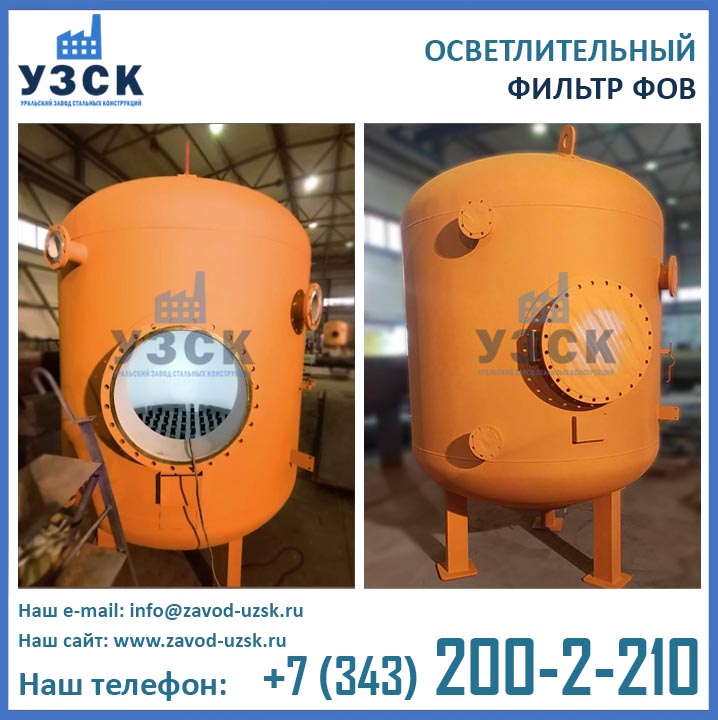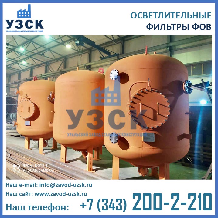 УЗСК – Уральский Завод Стальных Конструкций – ведущий производитель осветлительных фильтров ФОВ 2К в России, странах СНГ и ЕАЭС. Производство двухкамерных осветлительных фильтров диаметром 2,6 м с рабочим давлением 0,6 МПа осуществляется из листовой стали разных марок. Тип стали подбирается в зависимости от эксплуатационных характеристик оборудования.