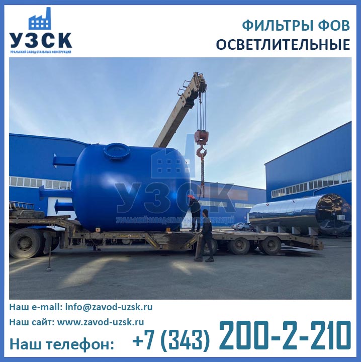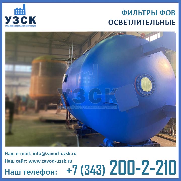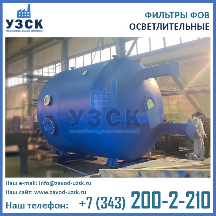 Изготовитель двухкамерных фильтров ФОВ диаметром 3,4 м с рабочим давлением 0,6 МПа — Уральский Завод Стальных Конструкций (УЗСК). Производство фильтров ФОВ2К выполняется из листовой стали. Подбор марки стали осуществляется в соответствии с условиями дальнейшей эксплуатации оборудования. Высокое качество продукции УЗСК подтверждено соответствующими документами, ознакомиться с которыми Вы можете в разделе «ДОКУМЕНТАЦИЯ» на нашем сайте. Завод УЗСК имеет все необходимое оборудование для изготовления двухкамерных фильтров ФОВ любой сложности, как типовых конструкций, так и по индивидуальным размерам и чертежам заказчика. Также наш завод располагает собственной лабораторией неразрушающего контроля и осуществляет гидравлические испытания готовой продукции на аттестованном гидростенде. При испытании фильтров ФОВ2К-3,4-0,6 дается пробное давление 0,9 Мпа (9,0 кгс/см2).