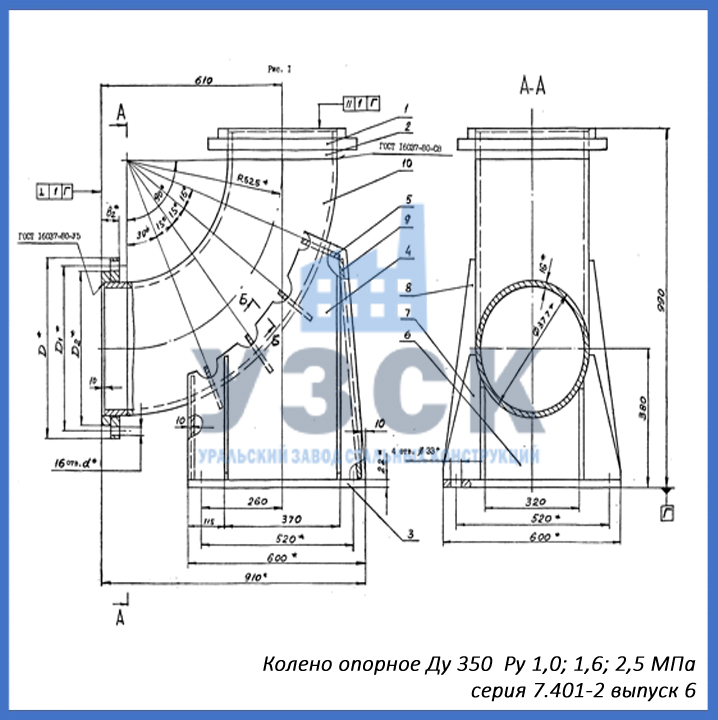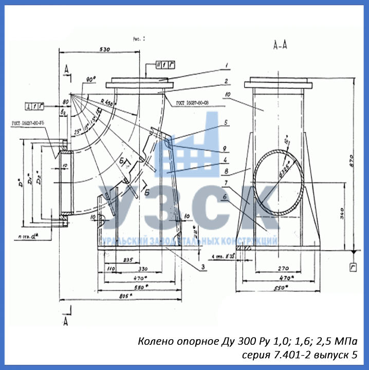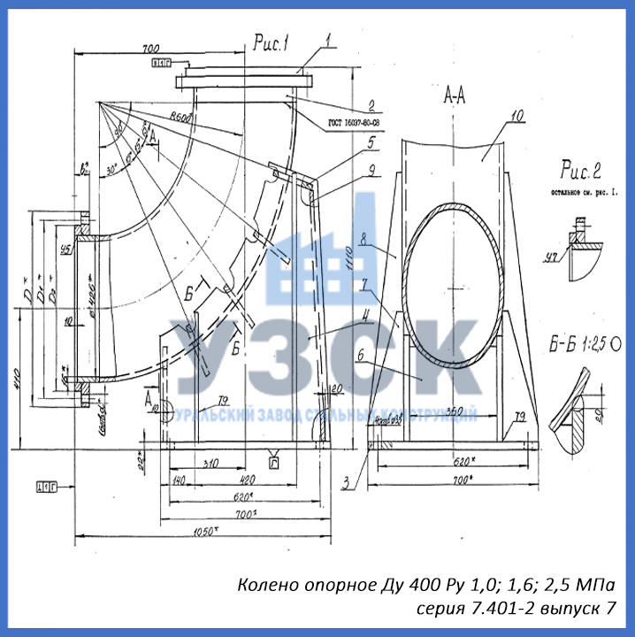 Выпуск 2 серии 7.401-2 представлен опорными коленами с условным диаметром Ду 300 мм, рассчитанными на рабочее давление от Ру 1,0 МПа до Ру 16 МПа.
