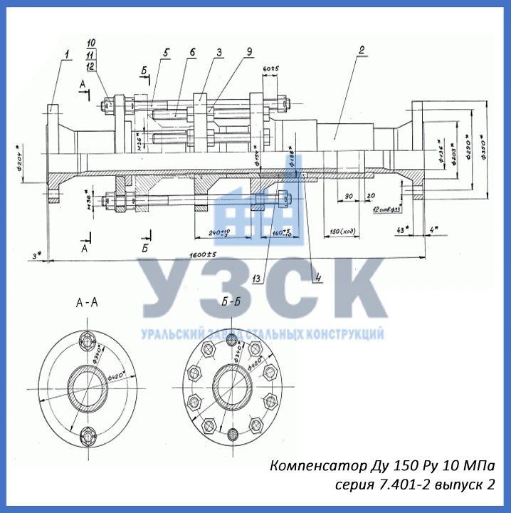 Выпуск 2 серии 7.401-2 представлен компенсаторами сальниковыми с условным диаметром Ду 150 мм, рассчитанными на рабочее давление от Ру 1,0 МПа до Ру 10 МПа.